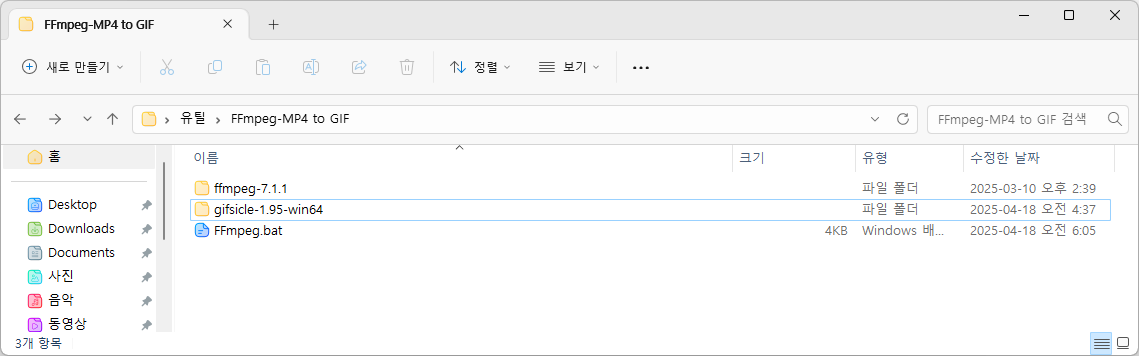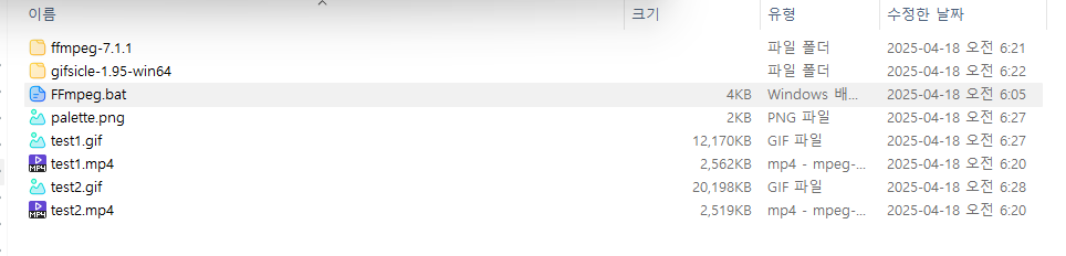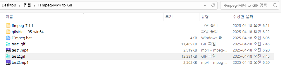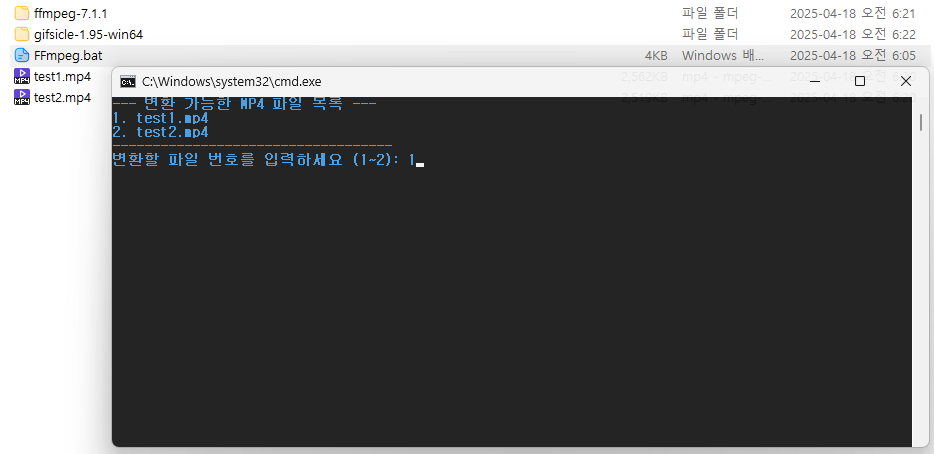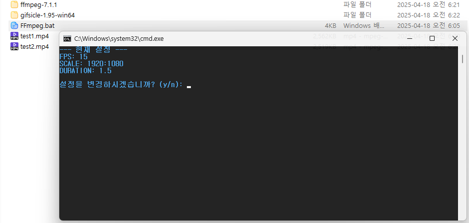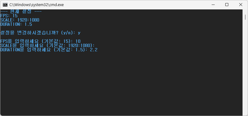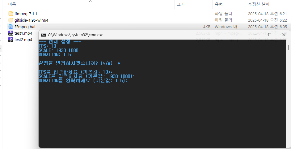 그럼 위와 같이 FFmpeg로 GIF변환 시 사용하는 변수 3가지를 입력할 수도 있고 그냥 기본값을 사용할 수도 있습니다.