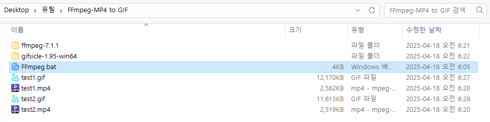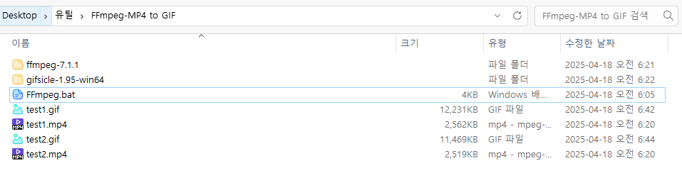 FFmpeg.bat와 폴더 2개가 있는 곳에 변환하고 싶은 mp4파일을 넣습니다.