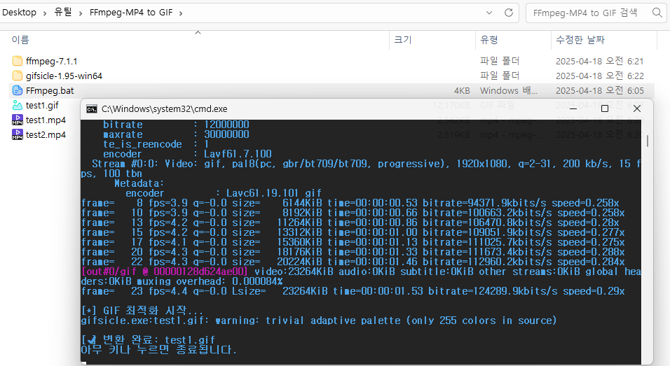 위처럼 완료되면 파일명.gif로 자동 생성이되고 아무키나 누르면 창이 닫힙니다.
