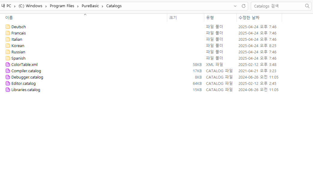 설치 방법 : 압축 파일 해제 후 나오는 Korean폴더를 사진처럼 C:\Program Files\PureBasic\Catalogs에 복사해 넣어주세요.
